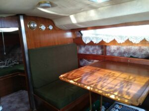 Das Boot ist ziemlich vergammelt und ungepflegt. Im Cockpit sind viele Flächen mit häßlichen Gummimatten verklebt, die original Sitzduchten und Backskistendreckel aus Teakholz, sind durch die „Verpackung“ leider vergammelt. Der Innenraum – oh Graus – ist mit dickem Teppich im Stil des Gelsenkirchener Barock ausgekleidet. Der Innenausbau aus Holz ist in den Jahren arg heruntergekommen und ungepflegt. Die Polster scheinen aus einer fernen Zeit zu stammen und der Schaumstoff bröselt. Kurz: Vor liegt ein Refit, der viel Zeit und Geld verschlingen wird. Technisch jedoch, scheinen Boot und Trailer von guter Substanz zu sein. Kurzentschlossen wird das Boot gekauft.
